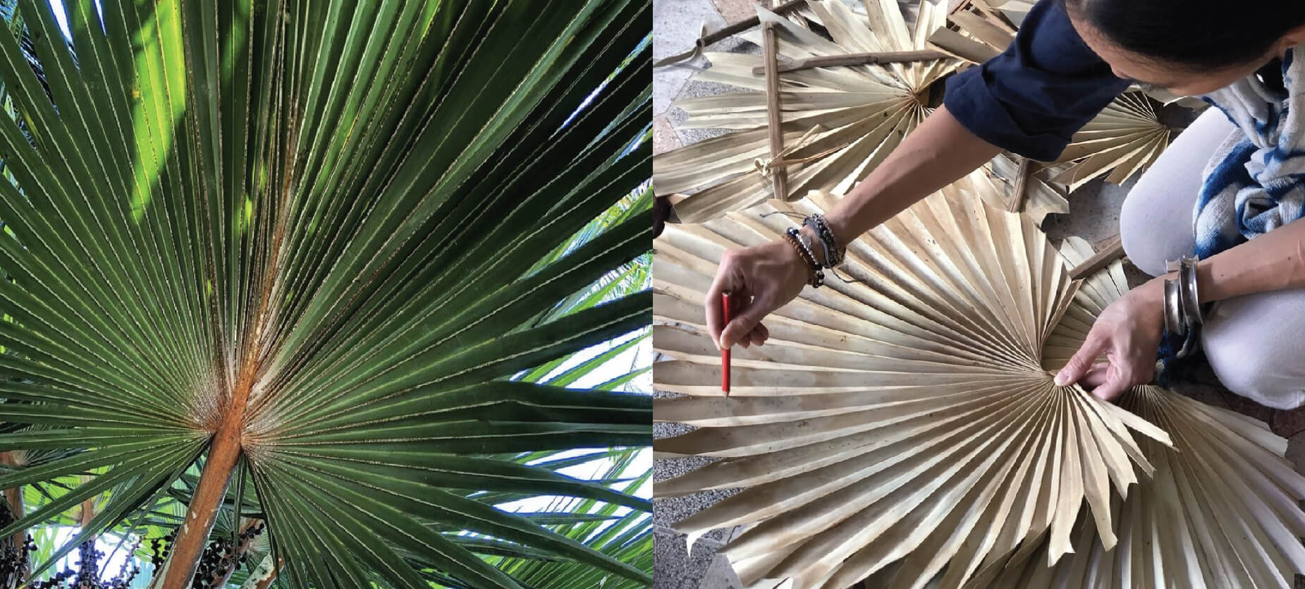 The Fan Palm plant itself (Corypha umbraculifera), from which the talapatra was made, is also a sort of miraculous tree which seems able to grow back even when burnt completely to the ground. Moreover, its life cycle is curious. When the palm’s life comes to an end, it simply flowers, bears fruit, and dies within one year. This could happen at any point whether the tree is 20 or 80 years old. Another amazing fact about the Fan Palm is that of all known tree species, it has the largest overall inflorescence, and some of the biggest leaves. A leaf can be as wide as 6 meters (almost 20 feet) and as long as 4 meters (13 feet)! Because of its unusual life cycle and the durability of its leaves, the fan palm had many practical uses in the lives of Lanna people. Parts of the tree were used to make small household utensils while its leaves were flattened and dried before being turned into pages onto which Buddhist scriptures and ancient texts could be inscribed.