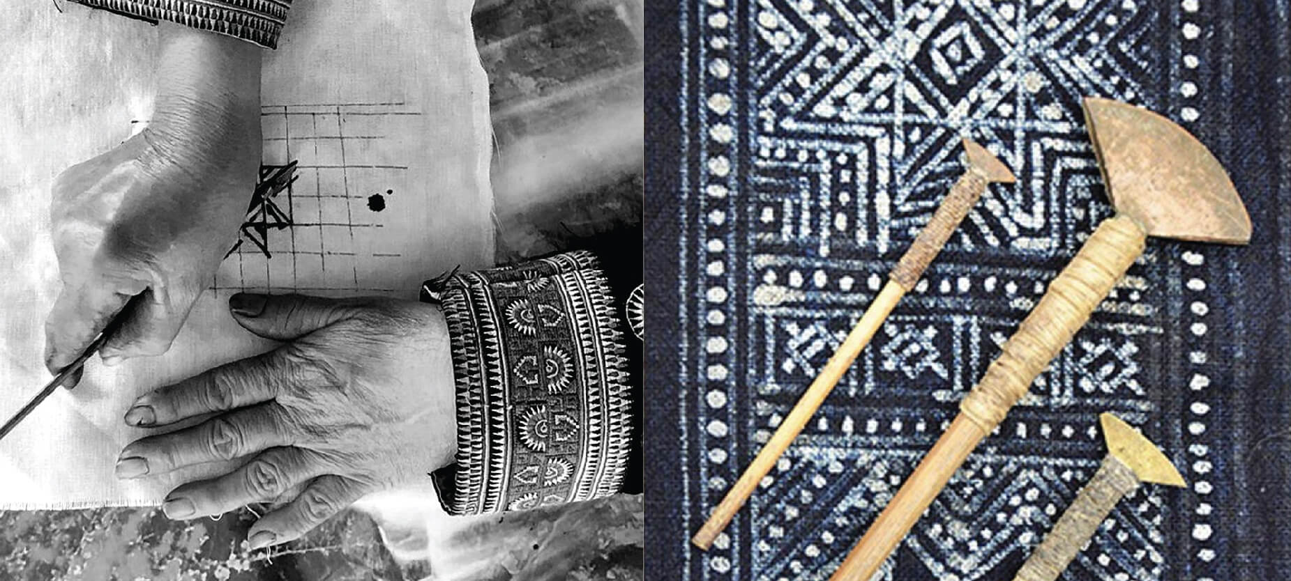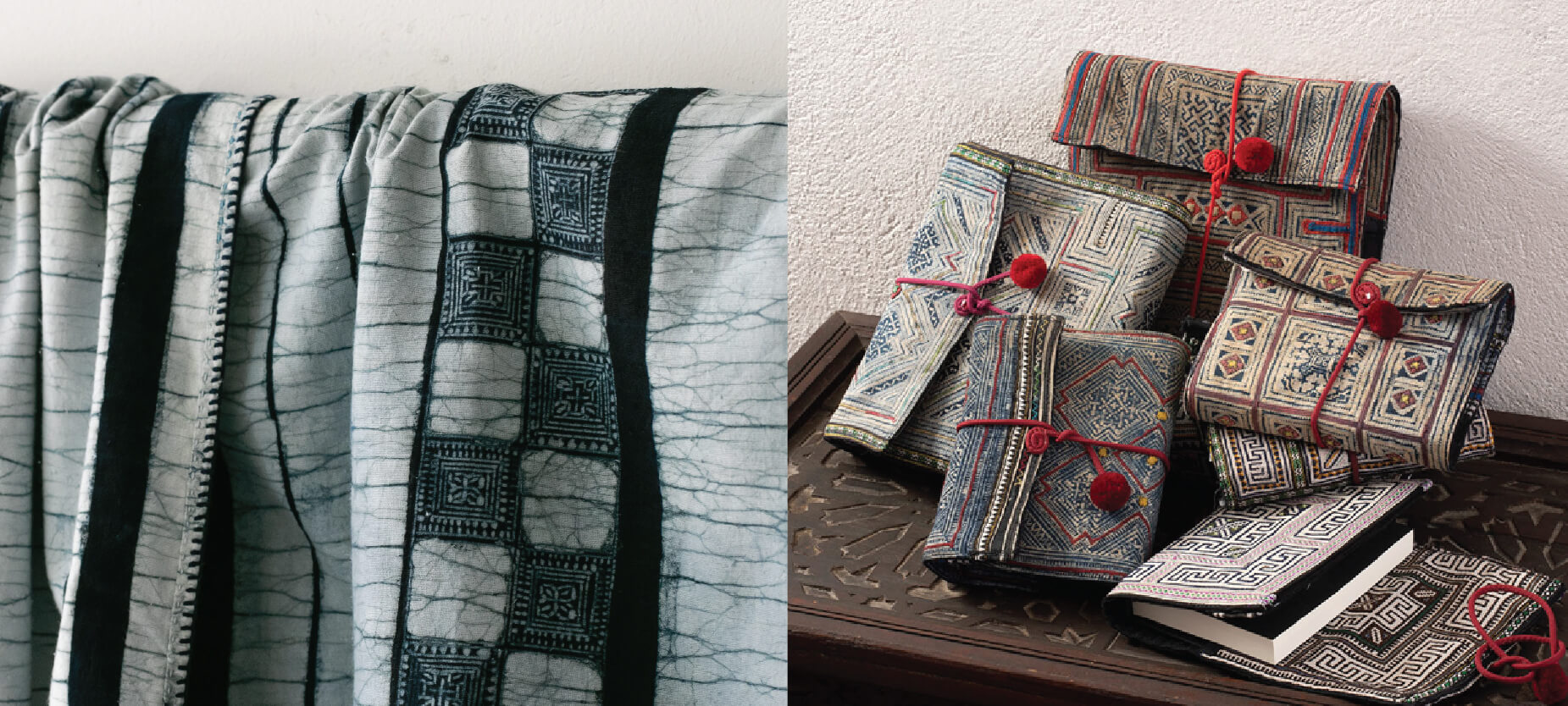 The patterns of the Hmong Batik are often inspired by nature and the personal experiences of the craftswomen. With the application of molten wax along the length of the hemp or cotton cloth, section by section, a grid of parallel lines filled in with geometric patterns—lines, dashes, dots, and swirls—and ancestral figurative motifs are created. The result is a fantastic cluster of diverse patterns and symbols, finely drawn in white or blue tones, all set in a spectacular, ordered matrix. The unique textiles signify the weavers’ integrity, each revealing a singular beauty and serving many purposes, identifying one group from another and, perhaps most importantly, adorning the wearer.